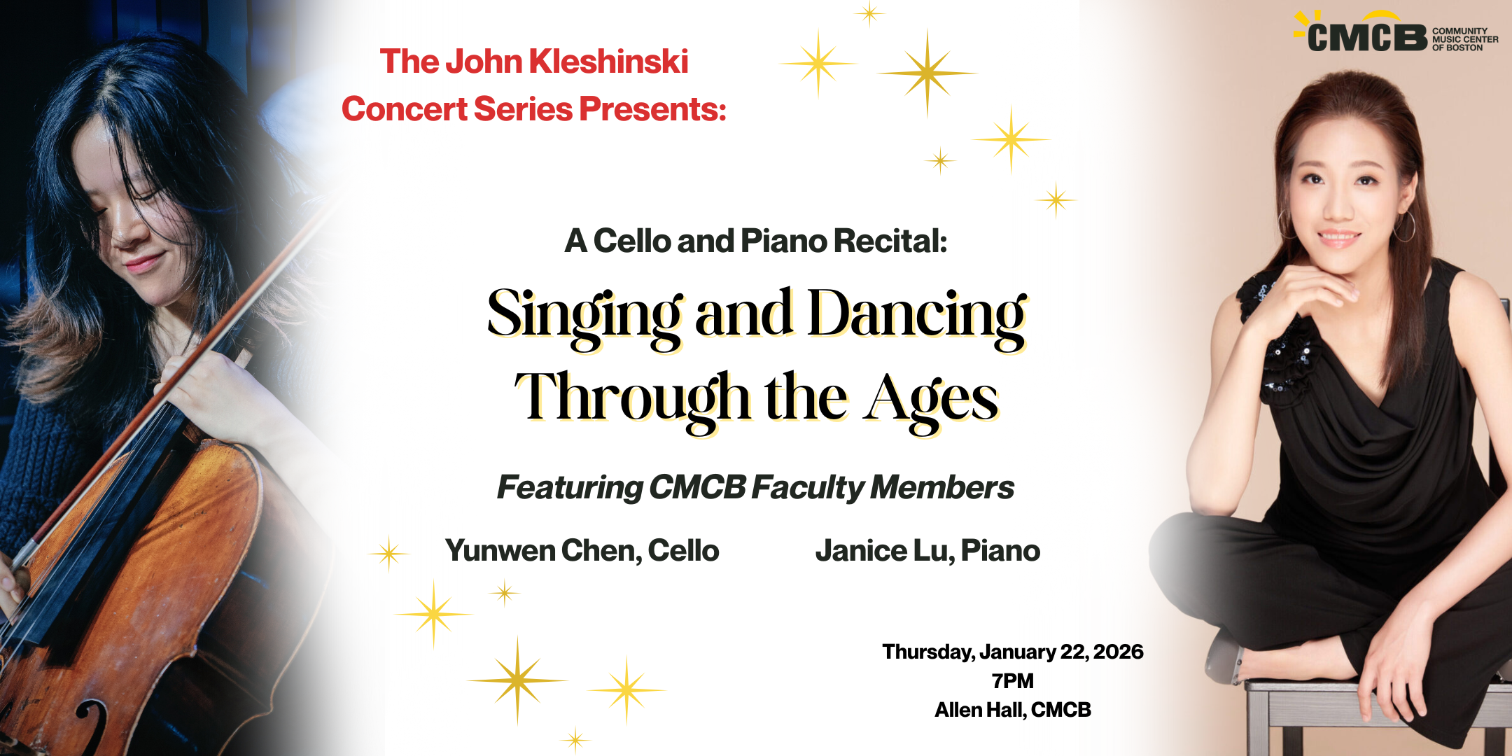 CMCB faculty members Janice Lu, piano, and Yunwen Chen, cello, will present an evening of cello and piano duets, featuring songs and dances across two centuries of music from a variety cultures around the world.